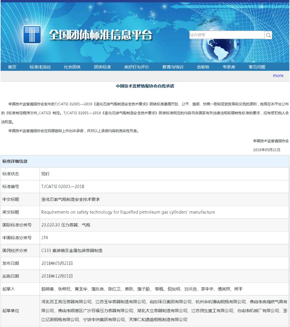 中国技术监督情报协会气瓶安全标准化与信息工作委员会(以下简称“瓶工委”)首个团体标准——T/CATSI 02 001-2018《液化石油气瓶制造安全技术要求》于2018年5月21日正式发布,并将于2018年12月1日实施。